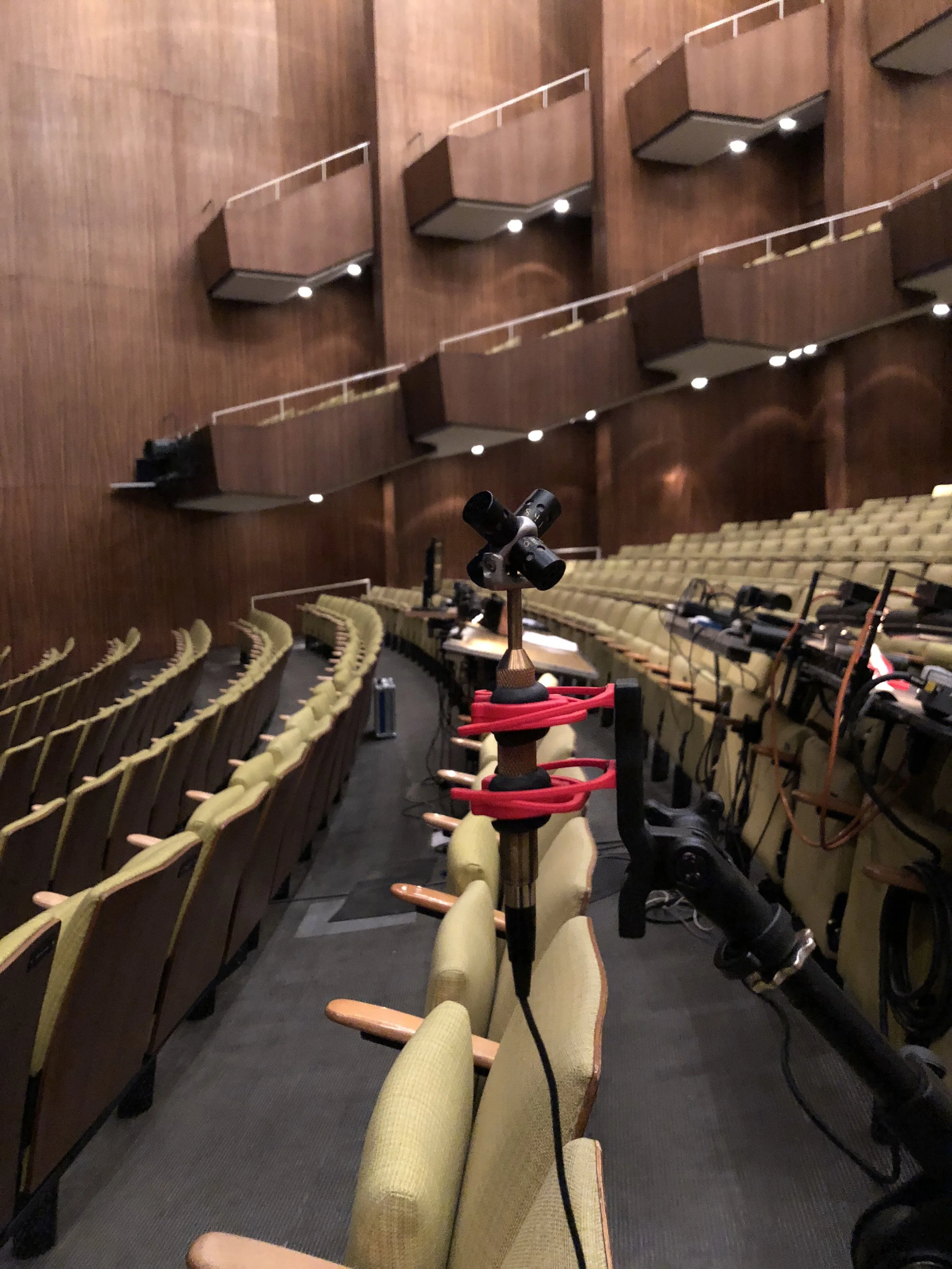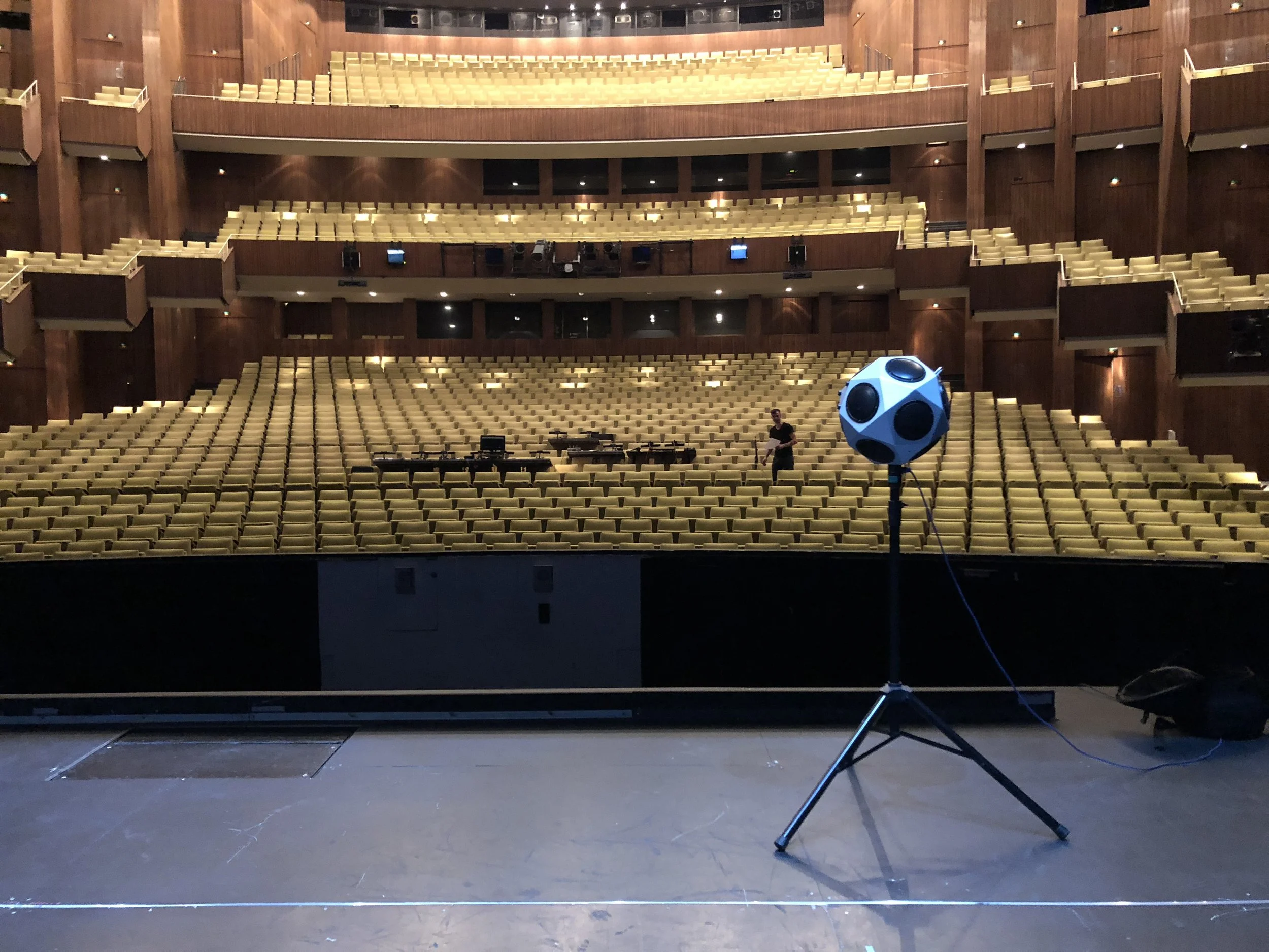 Foto: Raumakustische Messung im Rahmen einer Analyse der Deutschen Oper Berlin, Mikrofon TetraMic im Parkett (Projekt Simopera)